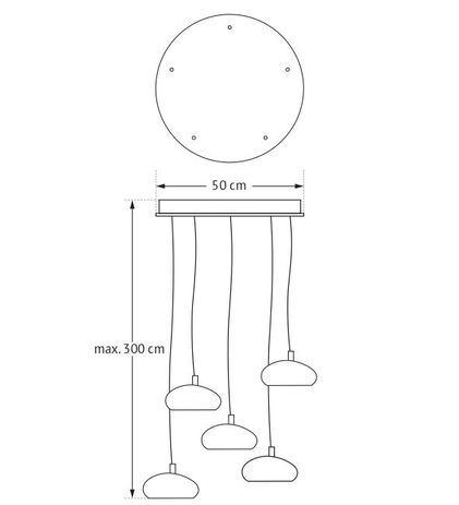 Hanglamp aan ronde plafondplaat diameter 50cm met 2 ovale kappen, 1 groot en 2 kleine ronde kappen. Voorzien van platte ingebouwde en dimbare led van 4 watt 650 lumen warm wit. Led driver in de plafondplaat ingebouwd.
